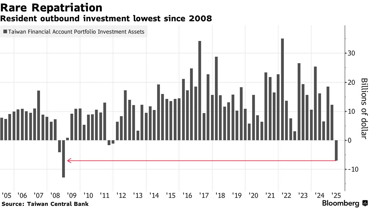 台灣央行週三發佈的國際收支數據顯示,第二季度當地居民拋售的外國證券規模創下2008年金融危機以來最高,而同期全球基金對台灣資產的持有量卻飆升至歷史新高。企業對外投資也出現激增。
