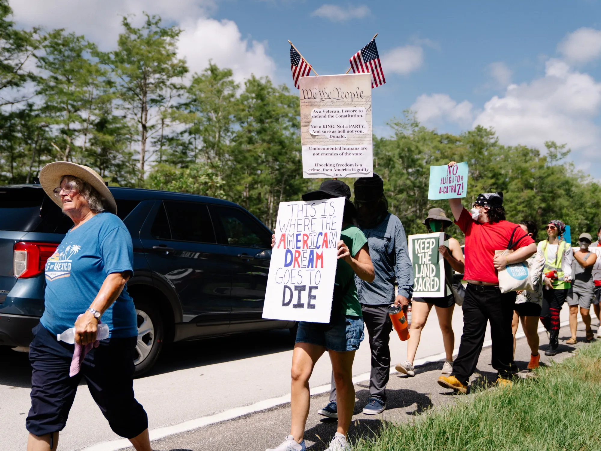 7月1日,示威者在佛羅里達州奧喬皮附近的埃弗格萊茲抗議"鱷魚惡魔島"拘留中心的建設。攝影師:Martina Tuaty/彭博社聯邦法官裁定,必須逐步關停並拆除這座名為"鱷魚惡魔島"的大型移民拘留營,這對佛羅里達州協助唐納德·特朗普總統驅逐數百萬移民的舉措造成了打擊。