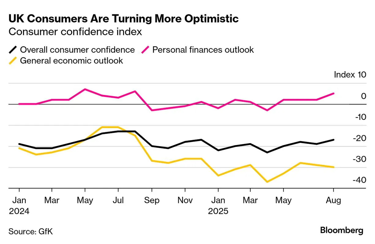 英國民眾 對財務狀況更為樂觀,8月GfK消費者信心指數升至5點,創一年新高。但復甦並不均衡,低收入家庭仍在應對通脹和食品價格上漲的壓力,而富裕階層推動了消費增長。