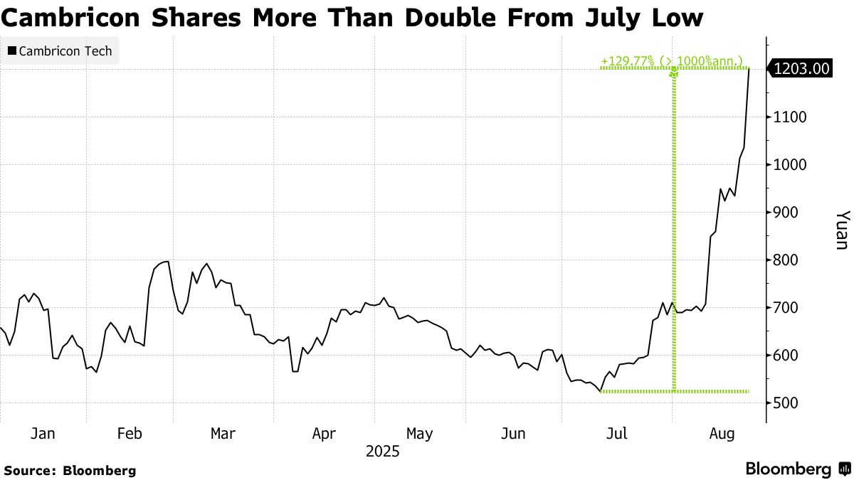 這家AI芯片製造商的股價週五飆升20%,此前有報道稱英偉達公司要求供應商停止生產H20芯片相關產品。這加劇了投資者對中國AI芯片製造商的押注,這些企業將成為替代供應商。自7月10日低點以來,該滬市股票已上漲約125%,成為同期滬深300指數中表現最佳的成分股。