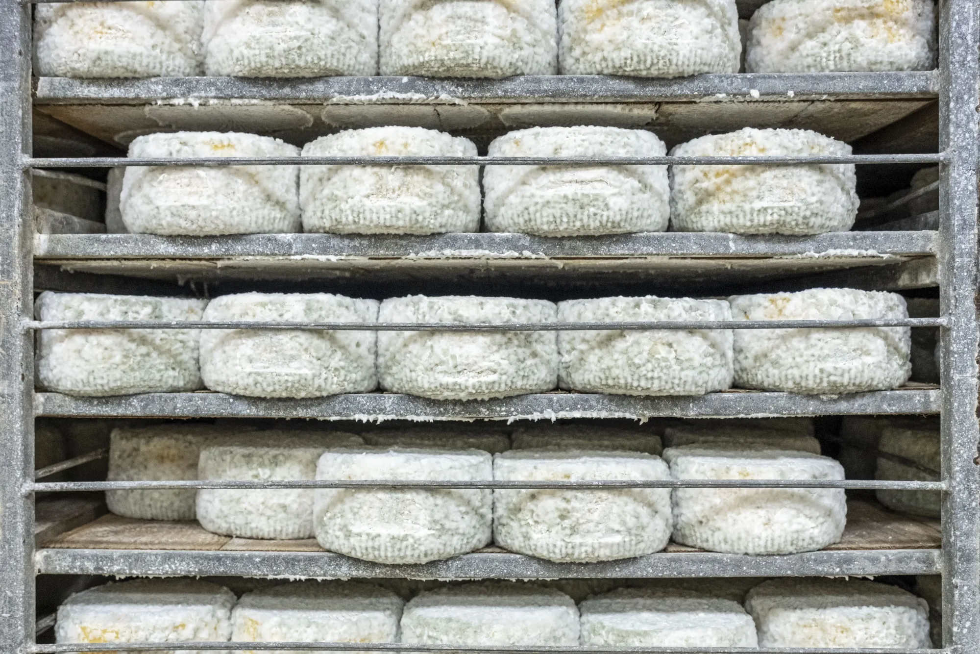 2020年,一名員工在法國羅德茲的拉克塔利斯集團乳製品工廠熟成室擺放羅德茲奶酪輪。