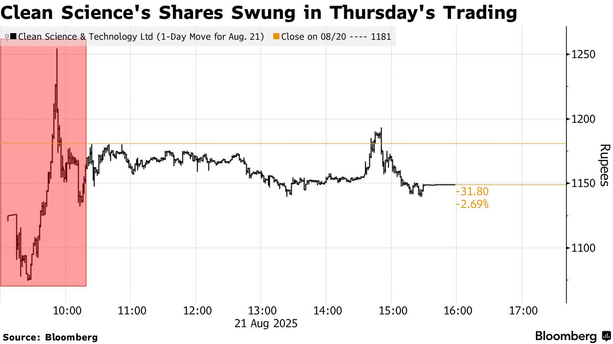 這場交易狂潮使Clean Science股價週四劇烈震盪,先是暴跌9.3%至1070.50盧比,隨後幾分鐘內飆升至1256.80盧比(漲幅17%),最終收跌2.7%。