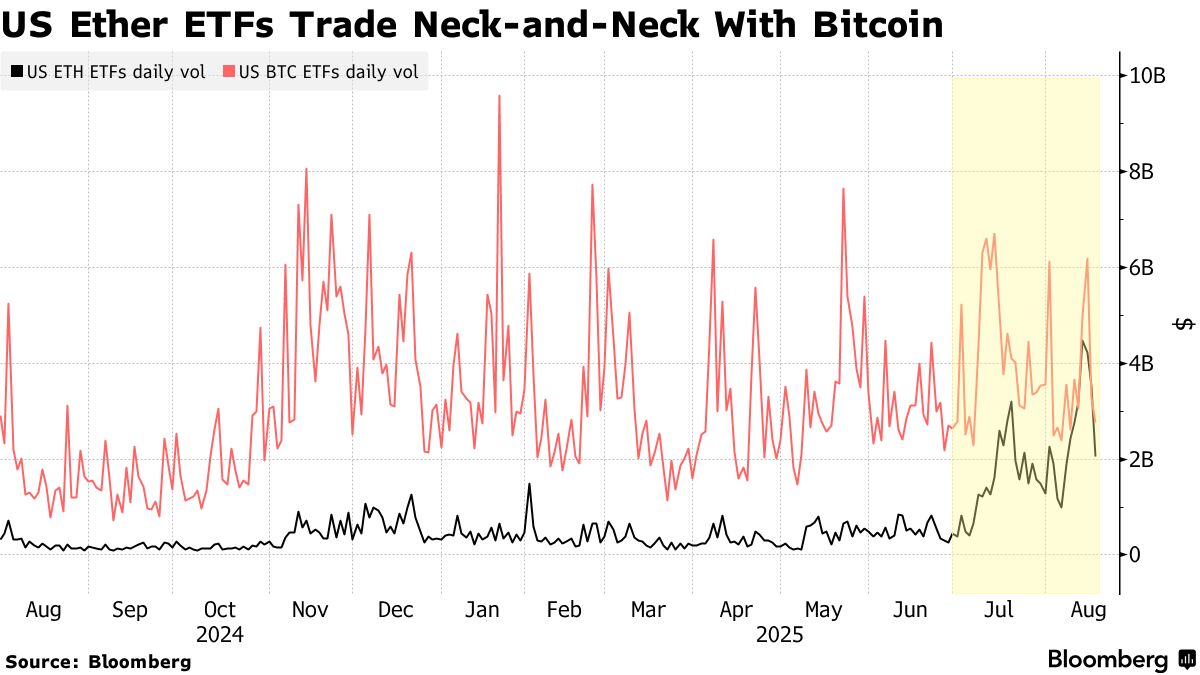 追逐價格波動的投資者正將目光投向第二大加密貨幣以太坊。在本月多個交易日中,伴隨企業搶購熱潮,以太坊ETF交易量已與比特幣ETF持平甚至反超。