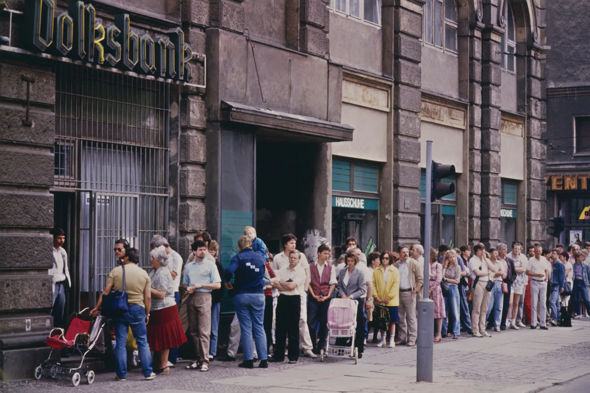 1990年東柏林市民兑換馬克的場景。攝影師:Derek Hudson/Hulton/Getty儘管這一跡象表明歐洲各國經濟差異懸殊,根本不具備統一貨幣條件,但德國仍同意建立歐元體系作為兩德統一的代價——這是法國總統密特朗為約束這個擴張後的強國繼續留在歐洲體系開出的條件。該協議是強行通過的。1999年新貨幣啓用後,包括深陷債務的希臘在內的所有歐元區國家被迫實施統一貨幣政策,卻仍保留自主財政政策制定權。