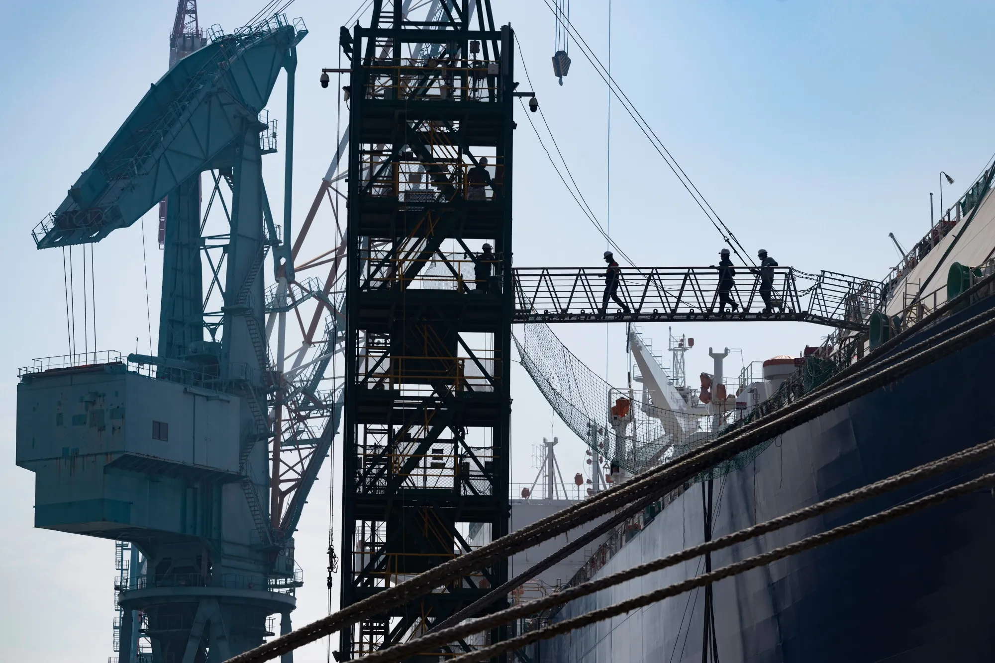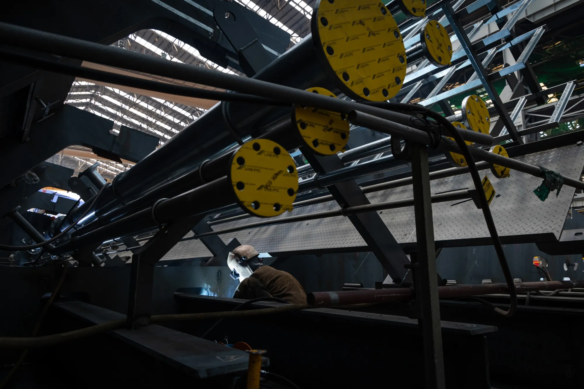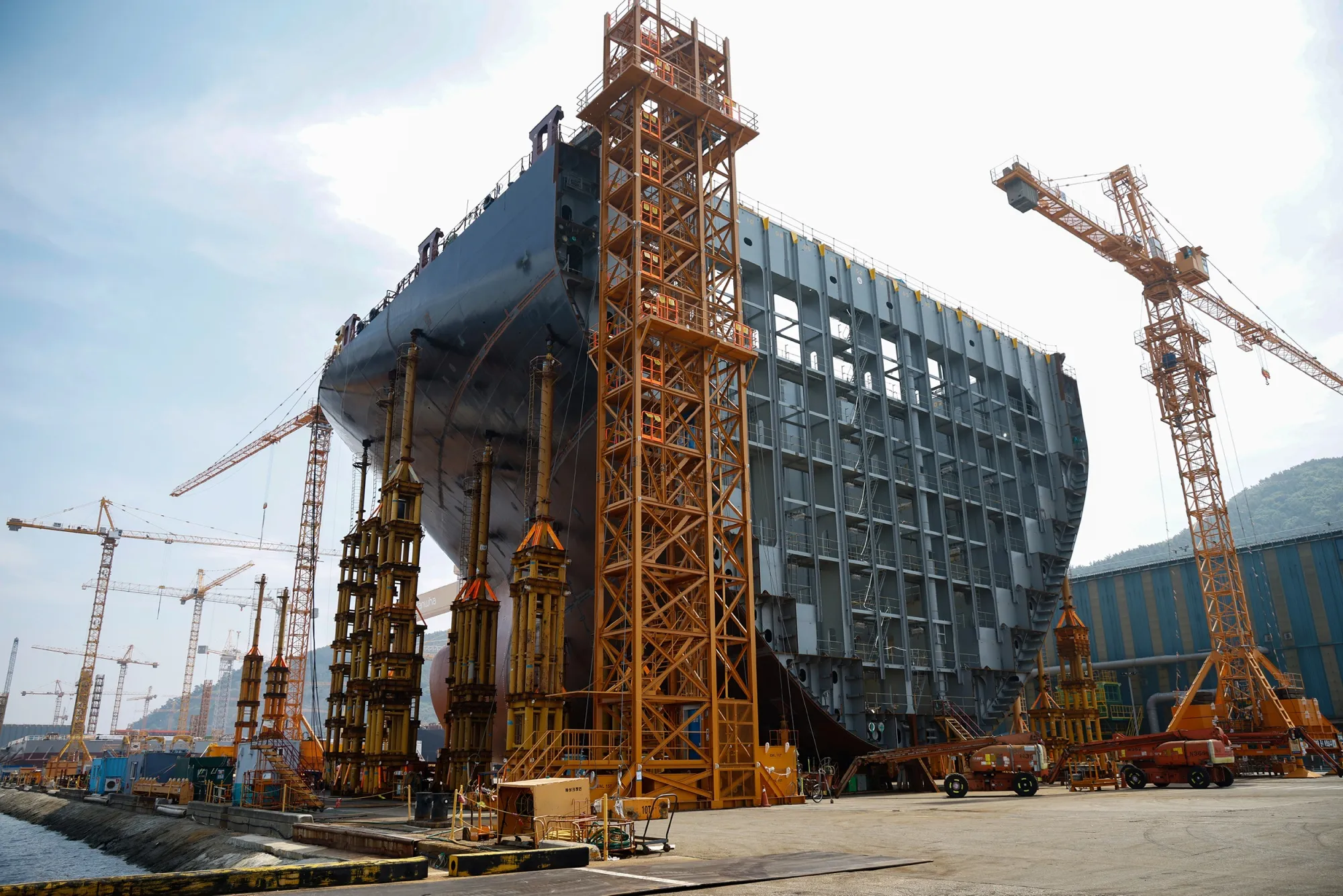 韓華造船廠的幹船塢——中國以外世界上最大的幹船塢之一——幾乎被半成品船舶佔滿。卡車大小的巨型鋼塊像樂高積木一樣排列着。這些龐然大物將逐步被改造成下一代油輪、超大型集裝箱船和液化天然氣運輸船,維繫全球經濟的運轉。
