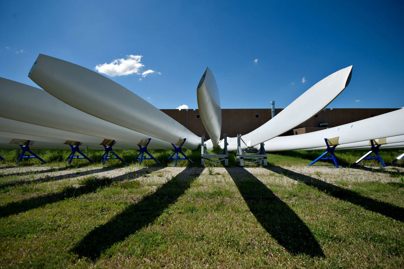 2012年6月22日週五,美國愛荷華州牛頓市,為通用電氣公司可再生能源業務製造的已完成風力渦輪機葉片放置在TPI複合材料公司製造工廠外。