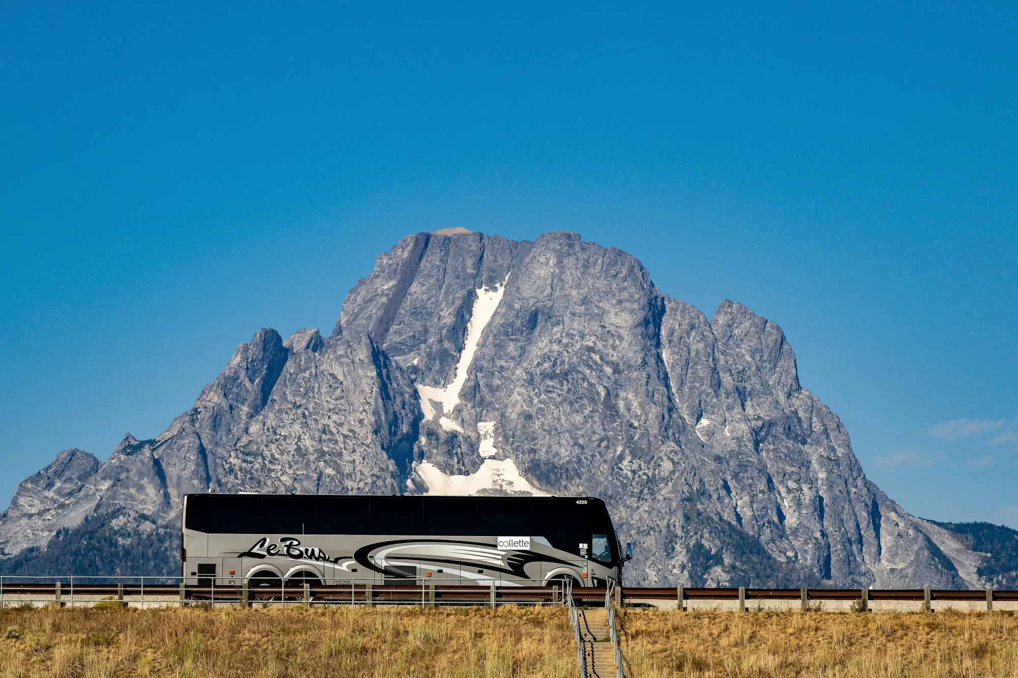 8月21日,一輛巴士駛過懷俄明州莫蘭鎮的傑克遜湖大壩。