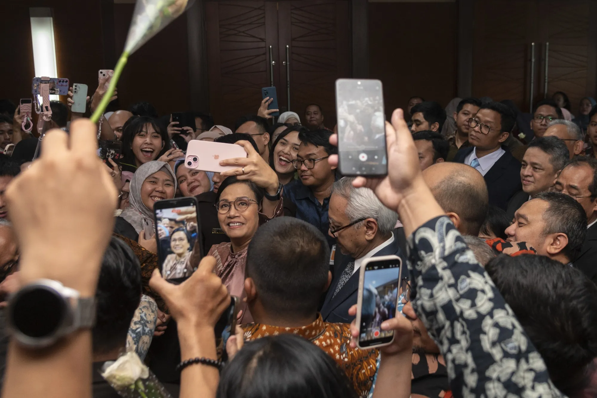 印度尼西亞即將離任的財政部長斯里·穆利亞尼·印德拉瓦蒂在雅加達的交接儀式上自拍。攝影師:羅莎·龐加比安/彭博社/彭博社### 明天你需要知道的