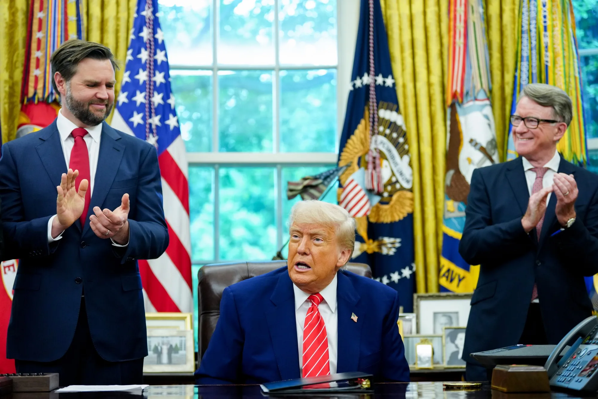 美國副總統JD·範斯、特朗普和曼德爾森在五月攝影師:博尼·凱什/UPI而解僱的原因也無助於跨大西洋關係:曼德爾森的郵件更加引起人們對特朗普與艾普斯坦過去關係的關注,包括對同一本生日書中歸於他的性暗示信件的質疑。(特朗普否認寫過這封信。)