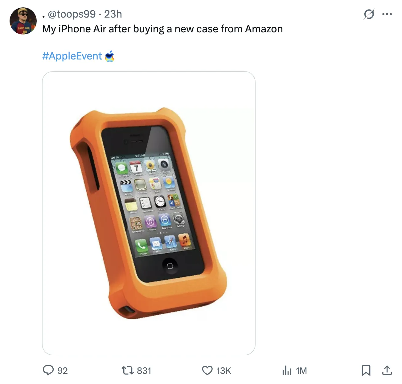 “所有這些使得iPhone Air成為一個小眾產品,專為那些必須購買每一款新蘋果產品的人或那些穿着牛仔褲太緊的人而設計(在那個特定的維恩圖中可能有很多重疊),”他寫道。不管褲子是否緊,我無法想象有人能把它放進他們的後口袋像這樣的保護殼: