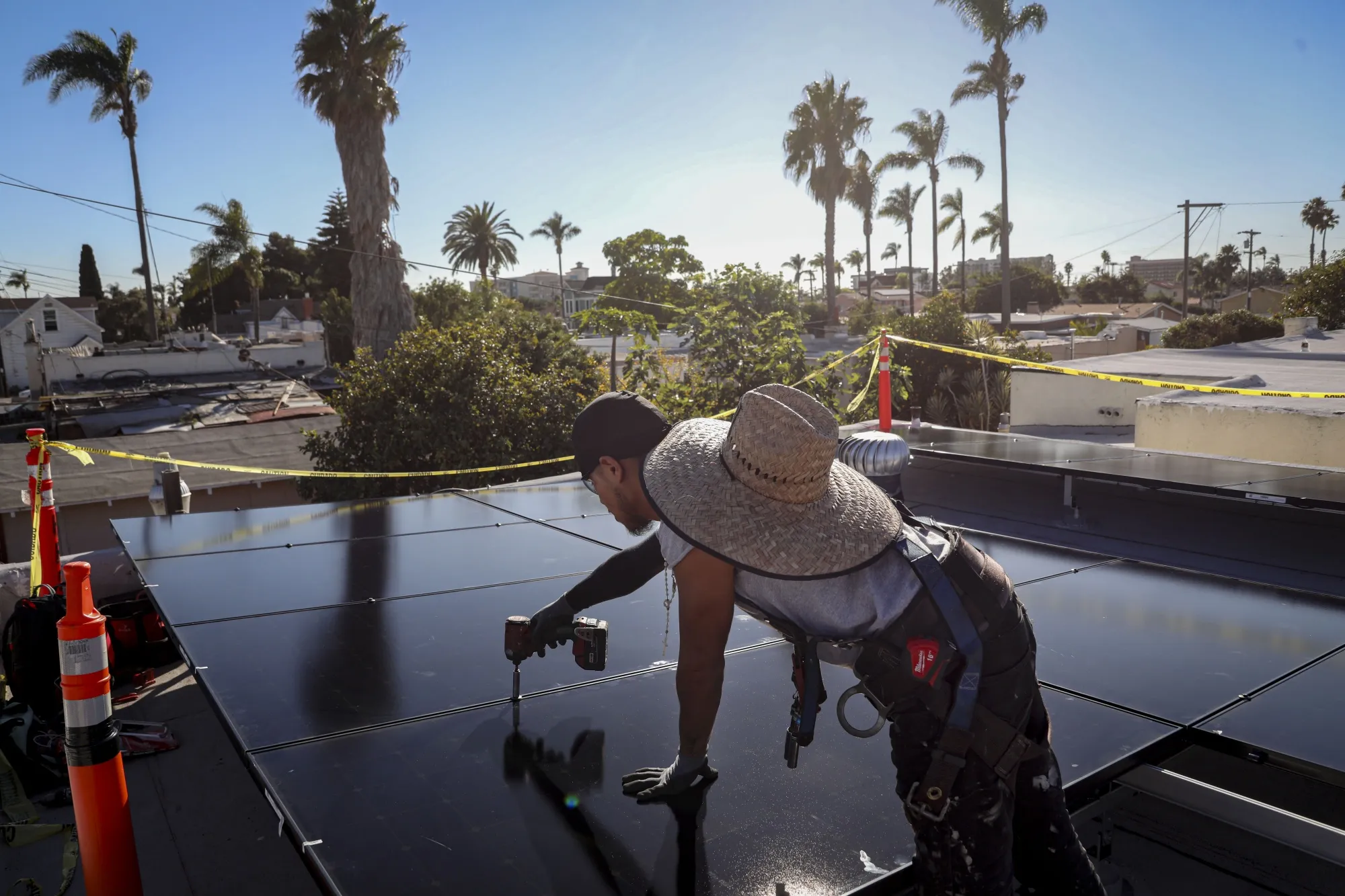 一名工人在加利福尼亞的一棟房屋屋頂上安裝太陽能電池板。攝影師:Sandy Huffaker/Bloomberg作者 Emma Court