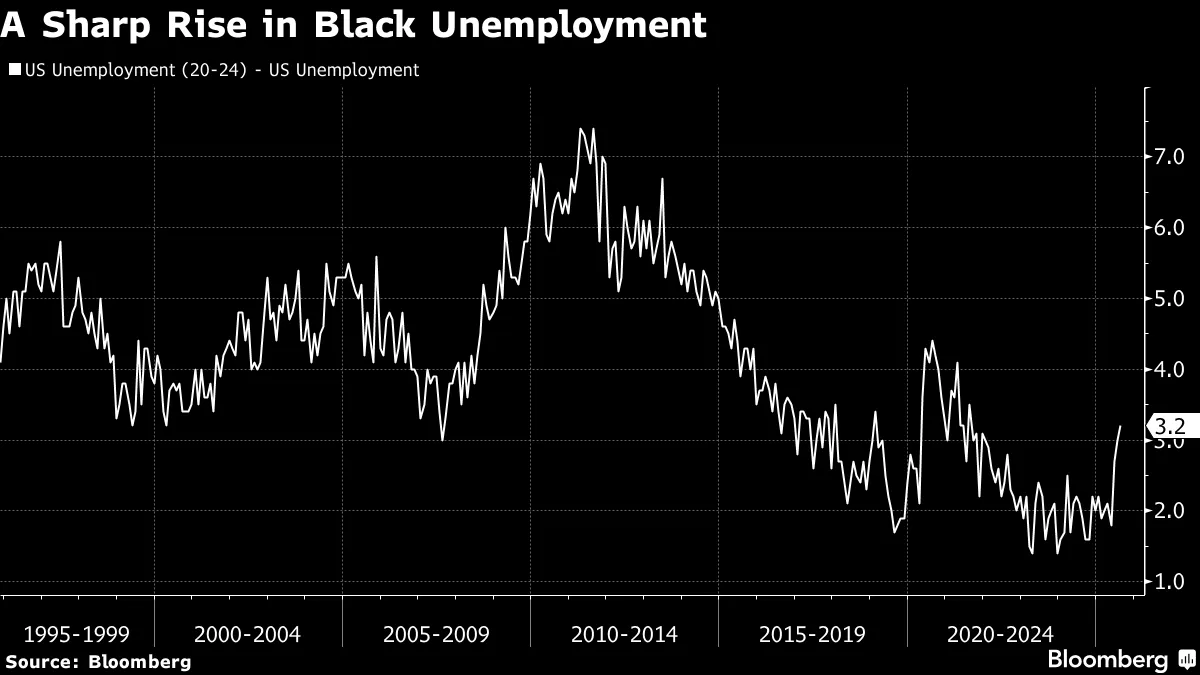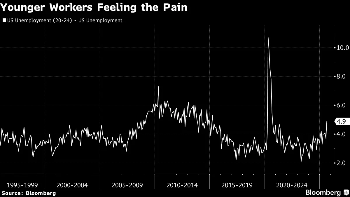 - 雖然失業率並沒有急劇上升,但確實有所上升。去年年底時為4.1%,而根據最新數據上升至4.3%。而且,確實有一些子羣體感受到的痛苦比其他人更嚴重。20-24歲工人的失業率急劇上升,因此你可能會認為這證明了故事與人工智能有關,因為理論上這些工具最有可能取代初級或入門級工人。然而,確實也有這樣的事實,當經濟下滑時,年輕工人的失業率比整體人口更糟糕。