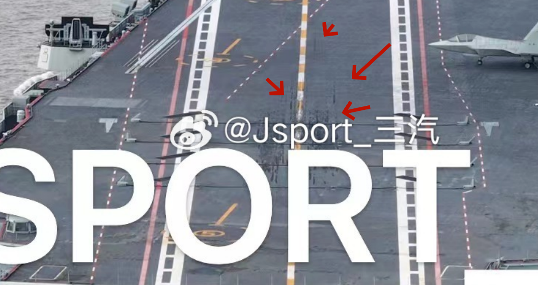 目前社交媒體上流傳的照片顯示,福建艦飛行甲板上,從攔阻降落區到電磁彈射器附近都有輪胎印,顯示很可能在這次海試期間,曾有艦載機多次在飛行甲板上起降。
