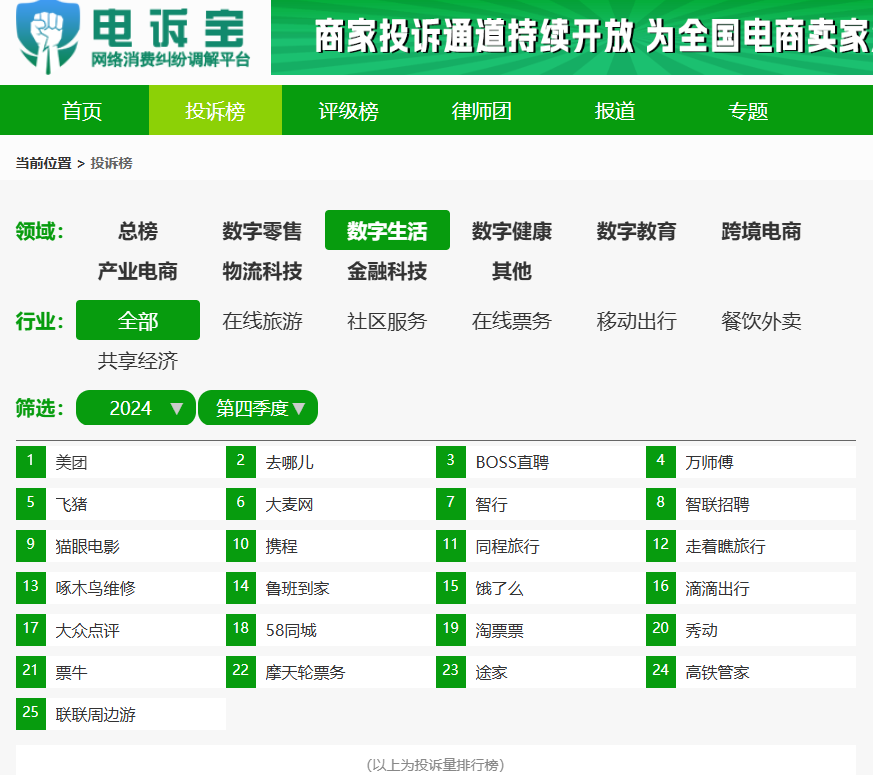 在2024年Q4全國數字生活評級榜中:獲**“建議下單”的有:美團、智行、去哪兒傅等3家;獲“謹慎下單”評級的有:BOSS直聘、萬師傅等2家;獲“不建議下單”的有:飛豬等1家;獲“不予評級”**的有:大麥網、貓眼電影、智聯招聘。
