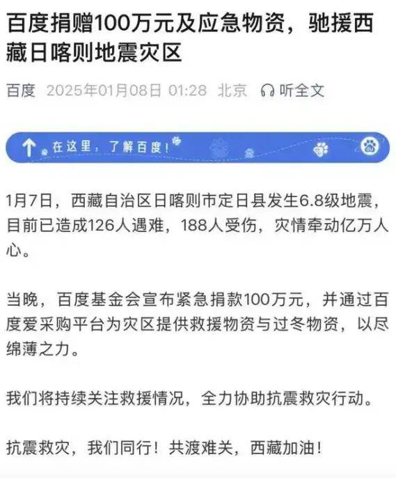 1月7日晚,百度基金會宣佈緊急捐款100萬元,百度表示,緊急捐款100萬元,並通過百度愛採購平台為災區提供救援物資與過冬物資,以盡綿薄之力。同時,百度將持續關注救援情況,全力協助抗震救災行動。