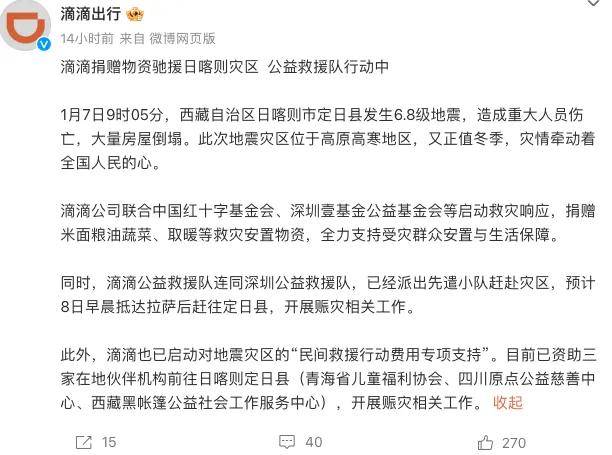 同時,滴滴公益救援隊連同深圳公益救援隊,已經派出先遣小隊趕赴災區,預計8日早晨抵達拉薩後趕往定日縣,開展賑災相關工作。此外,滴滴也已啓動對地震災區的“民間救援行動費用專項支持”。目前已資助三家在地夥伴機構前往日喀則定日縣(青海省兒童福利協會、四川原點公益慈善中心、西藏黑帳篷公益社會工作服務中心),開展賑災相關工作。