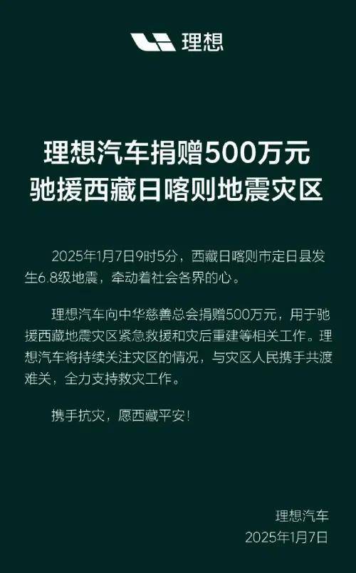 1月7日,理想汽車向中華慈善總會捐贈500萬元,用於馳援西藏地震災區緊急救援好災後重建等相關工作。