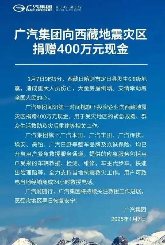 廣汽集團1月7日宣佈向西藏地震災區捐贈400萬元現金,用於受災地區的緊急救援、羣眾生活救助及災後重建等相關工作。