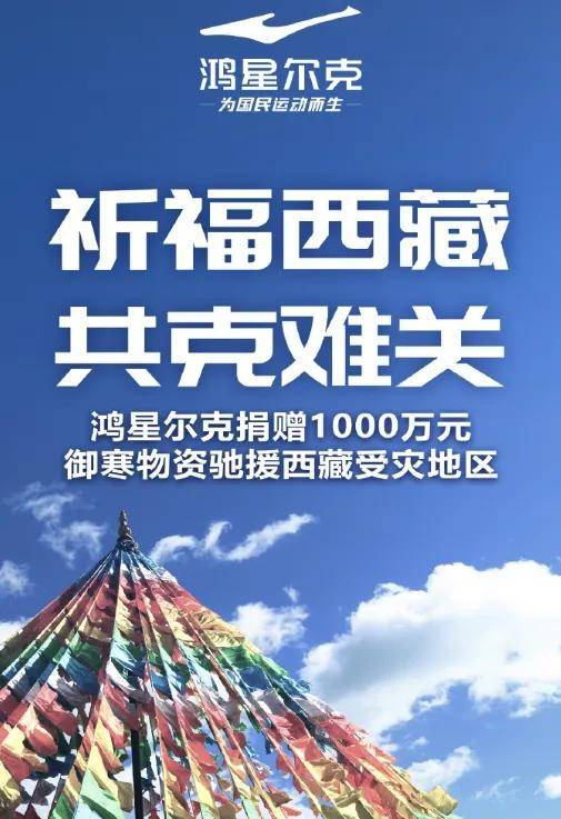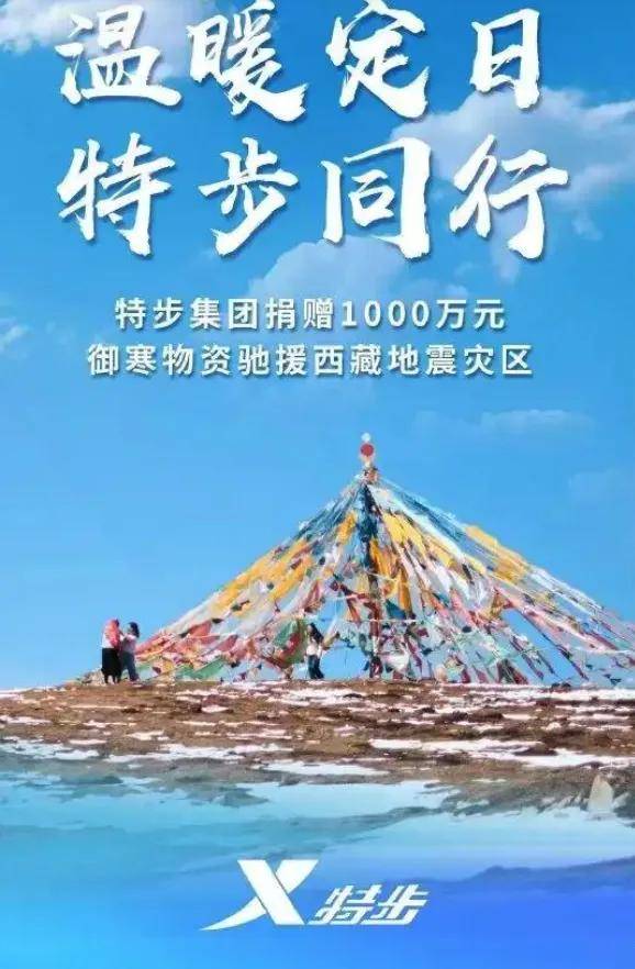 特步集團宣佈向西藏日喀則市定日縣受災地區捐贈1000萬元禦寒保暖物資,全力馳援抗震救災行動。