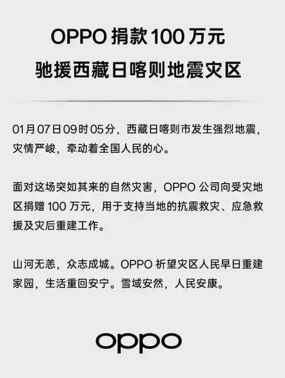 OPPO表示:西藏日喀則市發生強烈地震,災情嚴峻,牽動着全國人民的心。面對這場突如其來的自然災害,OPPO 公司向受災地區捐贈 100 萬元,用於支持當地的抗震救災、應急救援及災後重建工作。