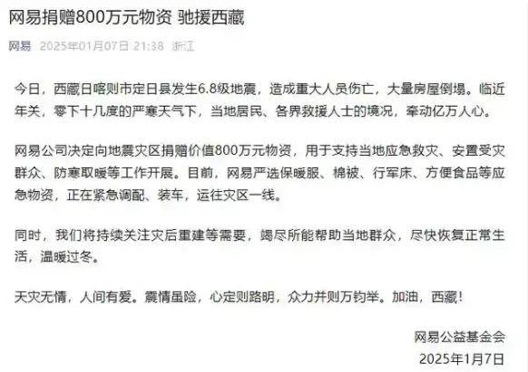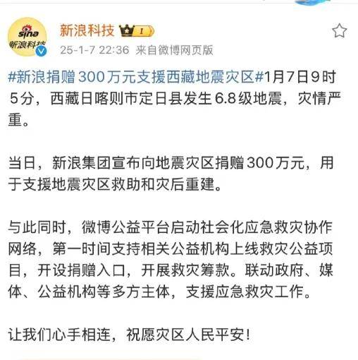 1月7日新浪集團宣佈向西藏日喀則市定日縣地震災區捐贈300萬元,用於支援地震災區的救助和災後重建。