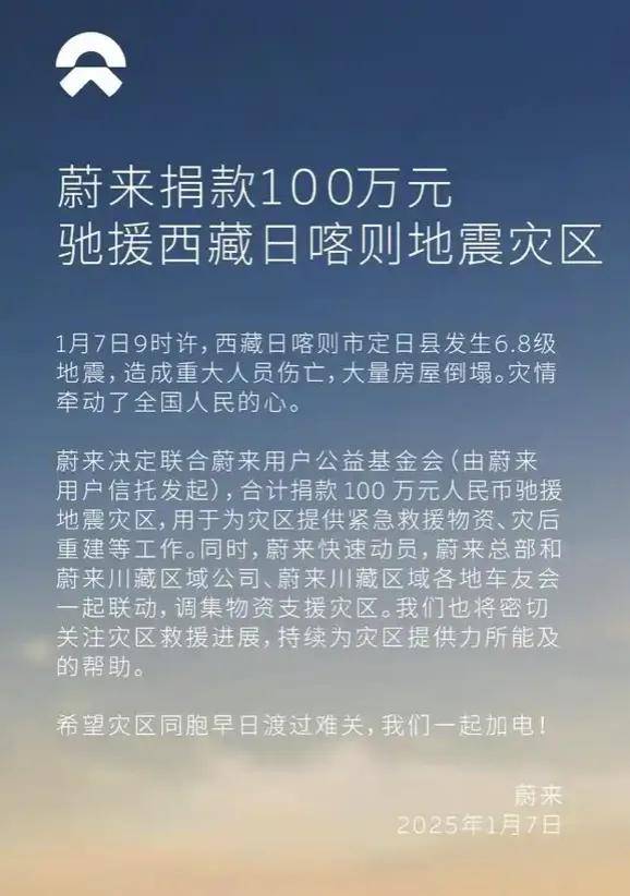 蔚來昨日發文宣佈,聯合蔚來用户公益基金會,捐款 100 萬元馳援西藏日喀則地震災區。