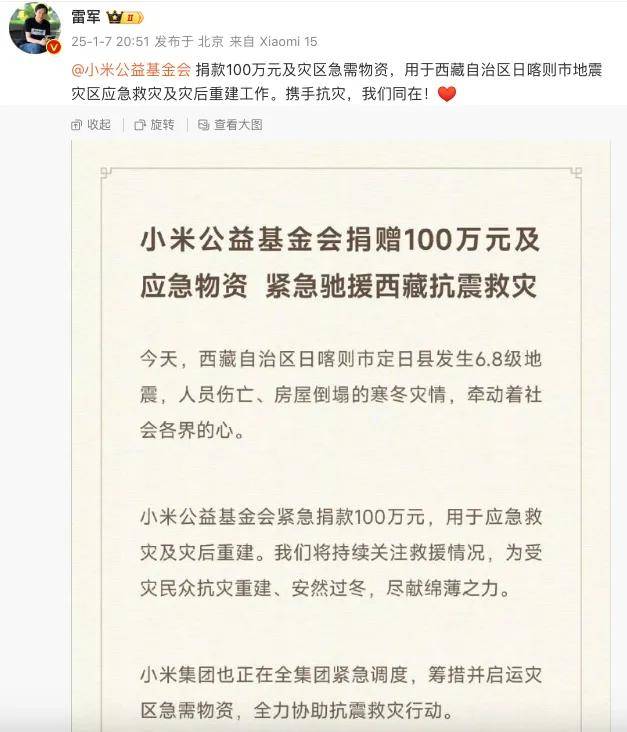 1月7日晚間,小米董事長兼CEO雷軍發佈微博稱,小米公益基金會捐款100萬元及災區急需物資,用於西藏自治區日喀則市地震災區應急救災及災後重建工作。