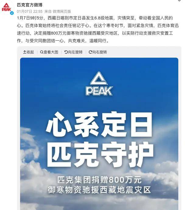 1月7日,匹克體育在官方微博宣佈,匹克體育始終將社會責任銘記於心。在這個寒冬時節,面對緊急災情,匹克體育迅速行動,決定捐贈800萬元禦寒物資馳援西藏受災地區,以實際行動支援救災安置工作,與受災同胞團結一心,共克難關,温暖同行。