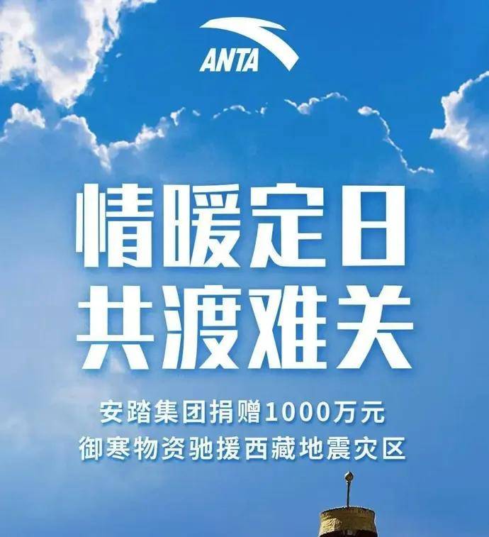 1月7日,安踏集團宣佈向西藏日喀則市定日縣受災鄉鎮捐贈1000萬元禦寒物資,全力支援西藏震區的抗震救災工作,物資將空運送達西藏。