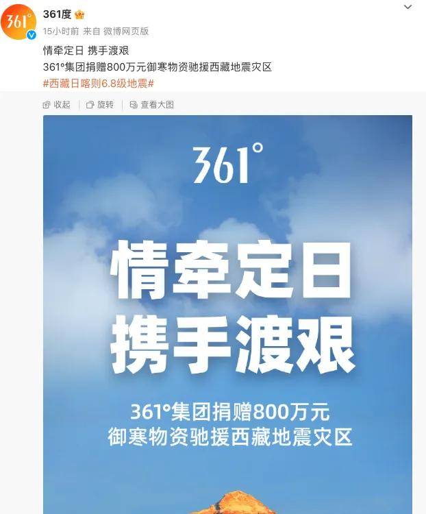 361°在微博宣佈,捐贈800萬物資馳援西藏。