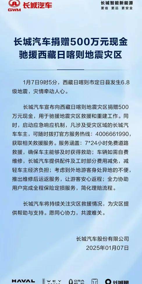 1月7日,長城汽車官方宣佈,緊急捐贈500萬元現金,馳援西藏日喀則地震災區。併為災區車主提供7×24小時免費道路救援、維修費用減免等多項關懷服務。