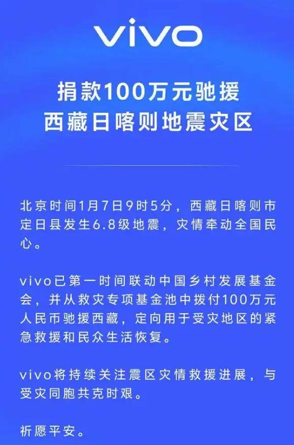 vivo 昨晚(1 月 7 日)宣佈,已第一時間聯動中國鄉村發展基金會,並從救災專項基金池中撥付 100 萬元人民幣馳援西藏,定向用於受災地區的緊急救援和民眾生活恢復。