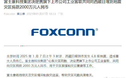 從富士康官方微信公眾號獲悉,富士康科技集團心繫災區同胞,決定攜旗下上市公司工業富聯,共同向災區捐款 2000 萬元人民幣,用於災區救援和災後重建等工作。