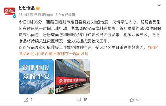盼盼食品在微博表示:盼盼食品集團在震後第一時間迅速行動,緊急調配食品飲料等物資,首批捐贈的5000件盼盼法式小麪包、盼盼軟麪包和盼盼冠豸山礦泉水已火速發車,馳援西藏災區。盼盼食品將持續關注災區情況,全力支援抗震救災工作。