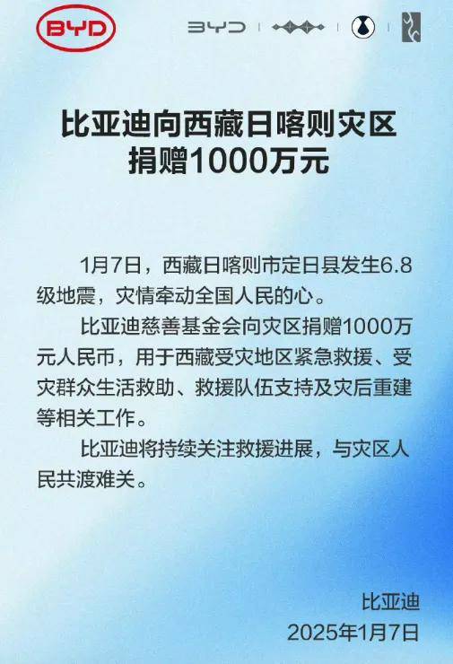 1月7日,比亞迪宣佈,比亞迪慈善基金會向災區捐贈1000萬元人民幣,用於西藏受災地區緊急救援、受災羣眾生活救助、救援隊伍支持及災後重建等相關工作。
