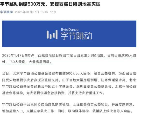 字節跳動表示,當日,北京字節跳動公益基金會捐贈500萬元人民幣,聯合公益機構為西藏日喀則受災地區提供災後救援及重建支持。
