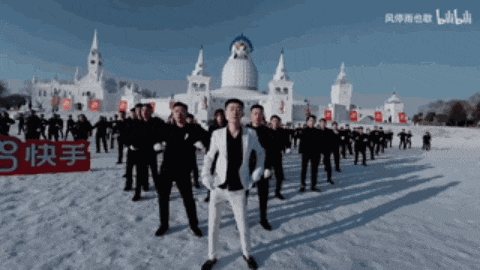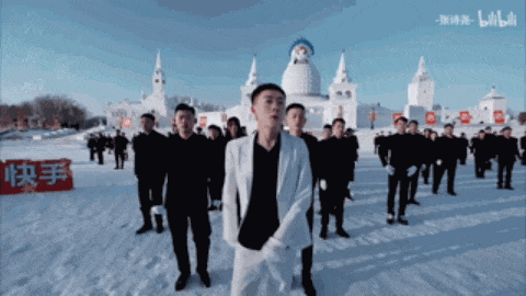 哈爾濱伏爾加莊園正前方廣場,“青海搖”鼻祖張詩堯率領上百位搖子們,身穿西裝緊身褲,戴着白手套,口號一喊,在冰雪世界裏震撼開搖,看這整齊劃一的程度,誰説內娛沒有刀羣舞?