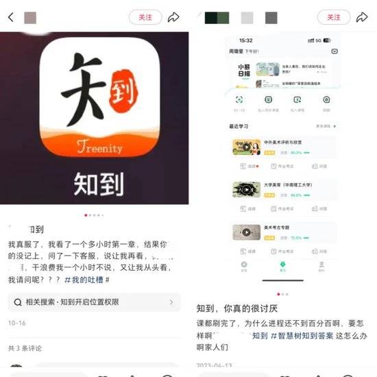 卓越睿新不僅銷售費用轉化效果低,其APP還引發用户吐槽。部分用户在社交媒體“小紅書”上表示“知到”APP的課程進度功能失靈,直接影響學分統計。一些用户反饋課程刷完後進度卻不到100%,還有人表示課程學習時間未被系統記錄。