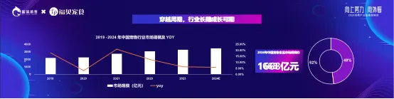 《2025年中國寵物行業白皮書》數據表明,到2024年年末,中國寵物經濟的規模已超過了3000億元。中信證券的數據也表明,整個寵物經濟大盤裏,寵物食品(佔據了)超過一半的份額,大概是1668億元的規模。