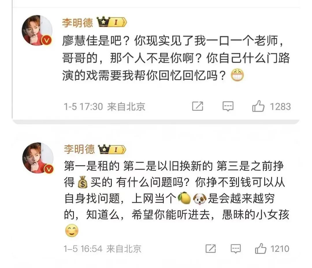 當“無產階級”人設翻車,李明德的回應則是內涵網友吃不到葡萄説葡萄酸,站在真正“工薪階級”對立面,化身“娛樂圈李佳琦”,稱“掙不到錢可以從自身找問題”,更是罵網友“愚昧的小女孩”。