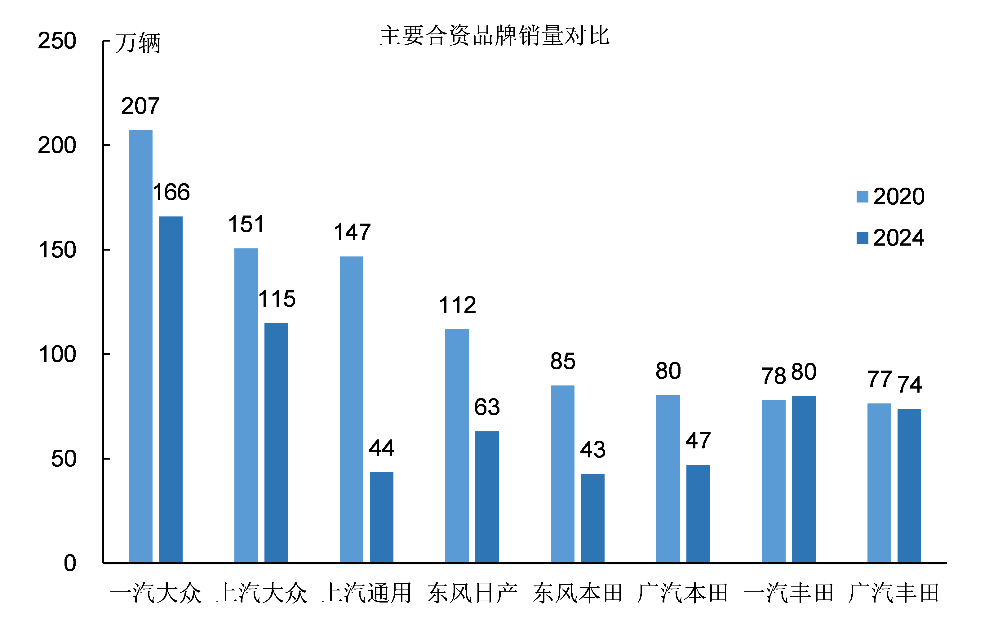 除了豐田所有合資品牌2024年在中國市場的銷量相比2020年都出現了大幅的下跌,上汽通用的銷量減少了70%,東風日產的銷量減少了43.8%,東風本田和廣汽本田的銷量均減少了40%左右,一汽大眾和上汽大眾的銷量減少了20%左右,只有豐田勉強保住了銷量水平。