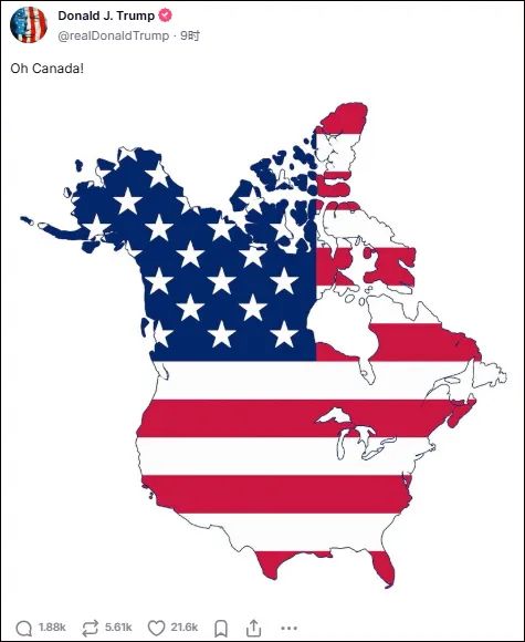 當地時間1月7日,特朗普在自創社交媒體平台“真相社交”發佈一張美加“合併”之後的美國“全新版圖”,並填充上美國國旗圖案。他配文:“哦,加拿大!” (圖源:特朗普社交媒體截圖)