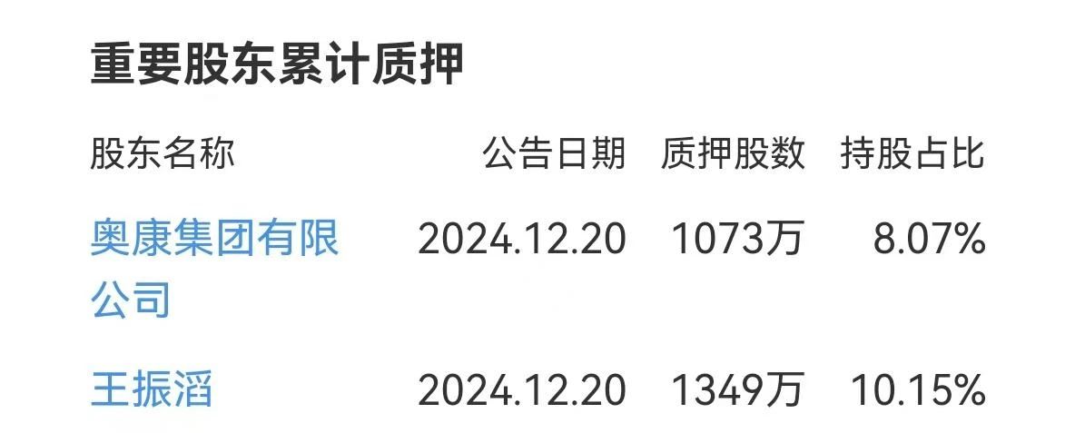 年復一年循環質押的結果,第一次質押時,奧康投資持有50.93%股份,王晨持有9.98%股份,王振滔直接持有13.38%股份。到最近一次質押時,奧康投資持股27.73%,王振滔直接持股15.1%,王晨已經不在十大股東之列。也就是説,一次次的循環質押之後,王振滔父子和奧康投資的股份都在不斷縮水。