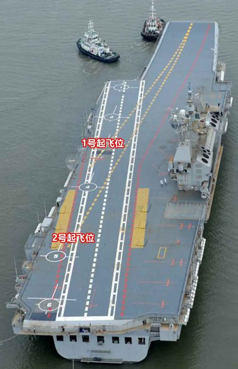 所以總體來看,咱的觀點是“國家航母項目”這個飛行甲板的設計奇奇怪怪的,像是單純為了這個三起飛點設計,做了大量的設計妥協:為了設計三起飛點,壓縮右舷艦載機整備區寬度;而右舷由於考慮到燃氣輪機排氣因素,無法繼續增寬;所以被迫增寬左舷、導致左右兩舷寬度不對稱;同時這個增寬的左舷導致艦載機從升降機提升到甲板上之後被迫需要轉移到左舷整備,而且整備的時候還是要侵入起飛線,極大地劣化了艦面航空作業的整體水準……