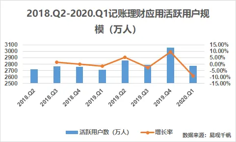 根據易觀千帆 2020 年整理的數據,記賬理財應用的活躍用户在 2700 萬到 3000 萬之間徘徊。