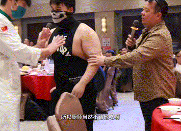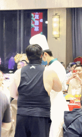 在喧鬧的氛圍下,忙不過來的服務員,將摔角手拉來給人上菜。正當大家疑惑摔角比賽何時開始時,摔角手竟然和廚師起了爭執,兩個“不會”吵架的廣東人互相推搡,從台下一路打到台上。
