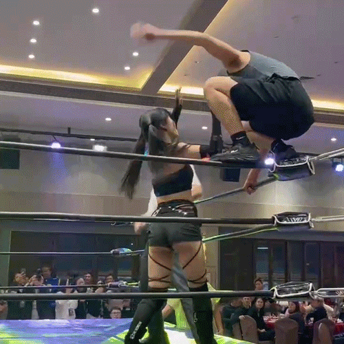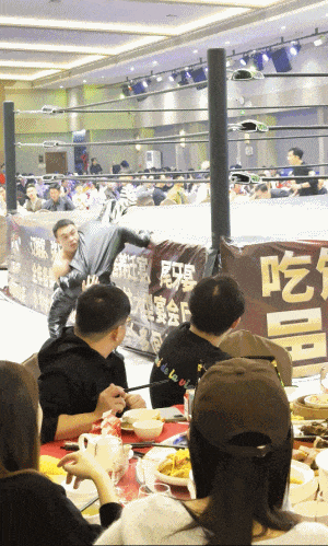 肌肉猛男抱着雙馬尾萌妹一頓猛摔,被倒掛在擂台圍欄上萌妹被瘋狂踹肚子,台下觀眾看得熱血沸騰,歡呼之餘手上的筷子也不忘往嘴裏塞蝦餃,服務員一副見怪不怪的樣子在人羣中穿梭。