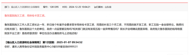 煙台廣播電視台主辦的“膠東在線”網站同樣顯示,2024年12月25日,該院曾因欠薪被投訴。有人留言稱:醫院拖欠人員工資長達一年,昨日挨個科室開會要求籤字用體檢卡頂工資,同意的補發三個月工資,不同意的就不發工資。