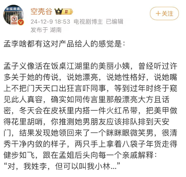 而漂亮小姨這個人設,讓我對孟子義有了更為清晰的認知。不是“迪冪孟扎”裏的尷尬抬咖,也不是過於簡化的笨蛋美人,小姨感讓她的漂亮第一次有了更多的內容。