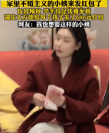 一身時髦的紅色大衣,化着精緻的妝容,舉止得體,出手闊綽,手上一疊鈔票,給排着隊拜年的侄子侄女們分發新年大紅包。